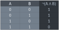 | NAND | ↑ ¬(A ∧ B) | ”NOT-AND” gate --- opposite of AND gate — output is 1 only if all the inputs are NOT 1. Output is only 0 when all the inputs are 1. NAND gates can have more than two inputs. | Sheffer stroke - Wikipedia | ![]() | ||