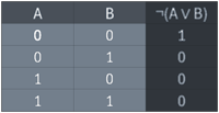 | NOR | A ↓ B ¬(A ∨ B) | ”NOT-OR Of OR gate” — output is only 1 if both of the inputs are 0. If either of the inputs, or both the inputs. are 1, then the output is 0. NOR gates can have more than two inputs. | Logical NOR - Wikipedia | ![]() | ||