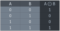 | XNOR | ⊙ ↔ ¬(A ⊕ B) (A ∧ B) ∨ (¬A ∧ ¬B) | ”Exclusive-NOR gate” — opposite of EX-OR gate — output is only 1 when both the inputs are 0 or both the inputs are 1. Output is 0 when either Of the inputs is 1. | Logical equality - Wikipedia | ![]() |